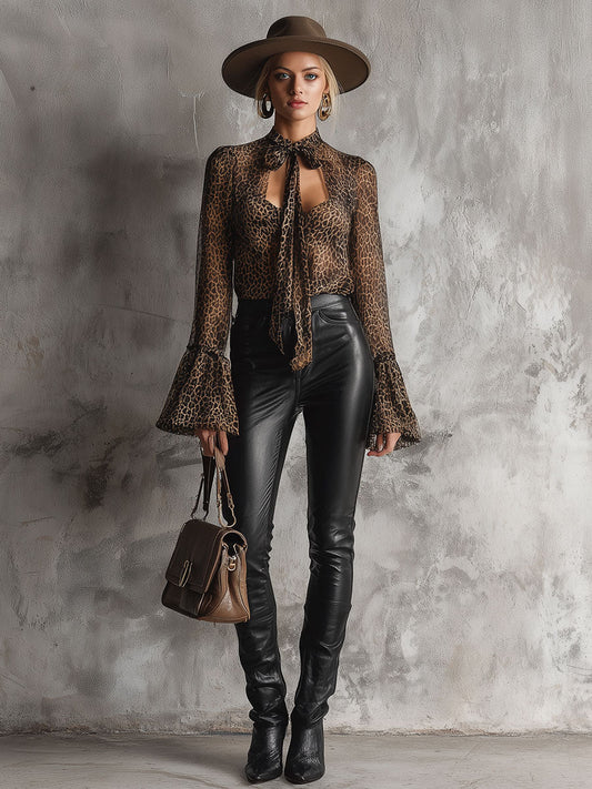 Chemise Rétro à Manches Évasées avec Nœud Papillon Imprimé Léopard Marron