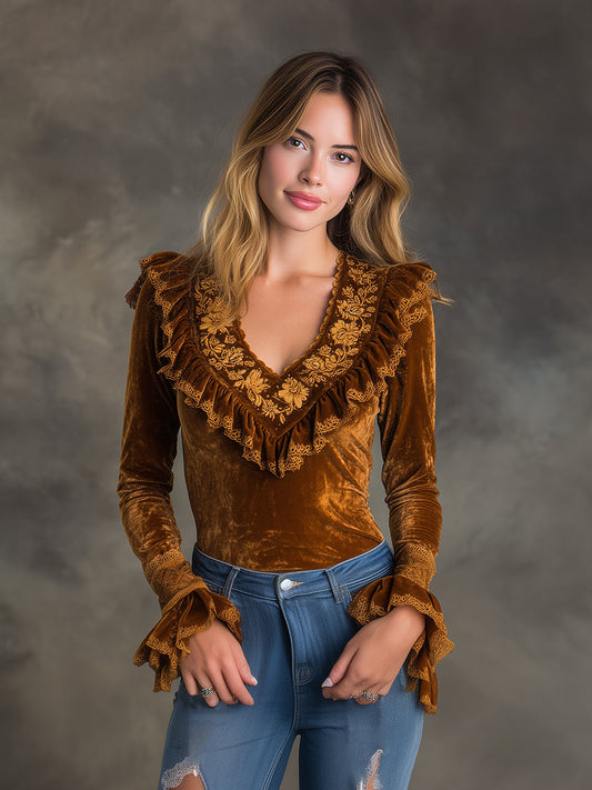 Chemise Rétro en Velours Brun Cocoa à Manches Longues avec Volants et Col en V