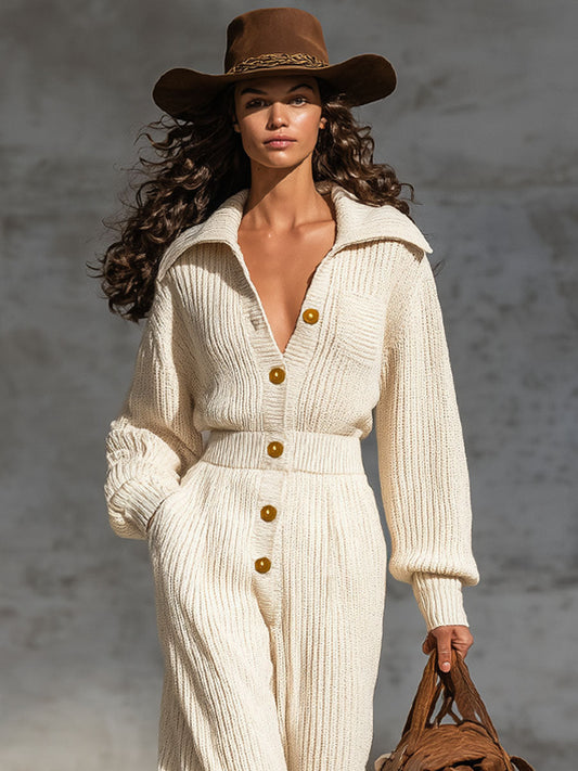 Combinaison Tricotée Élégante avec Revers et Boutonnage Minimaliste
