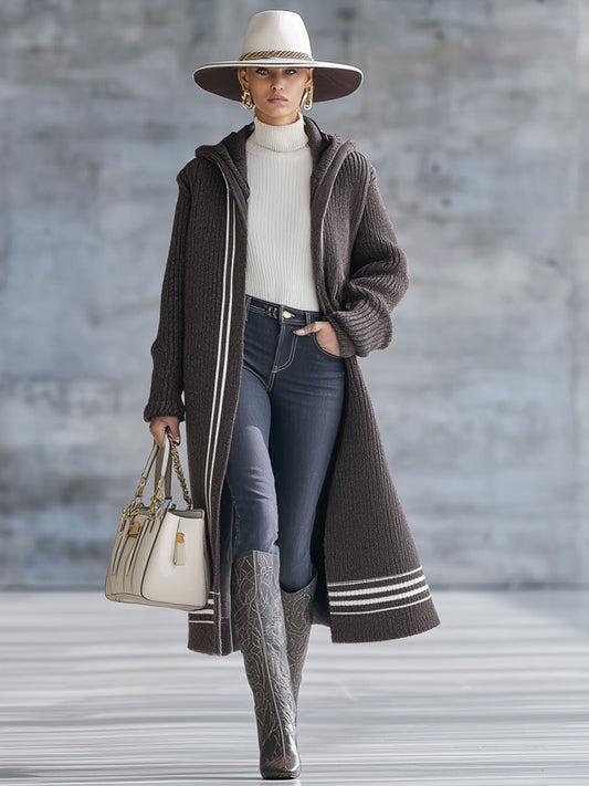 Cardigan Décontracté à Capuche en Tricot Rayé Chocolat