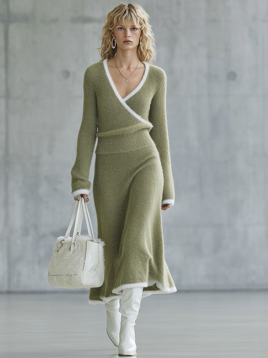 Robe Maxi Tricotée Élégante avec Col Montant Contrasté en Vert