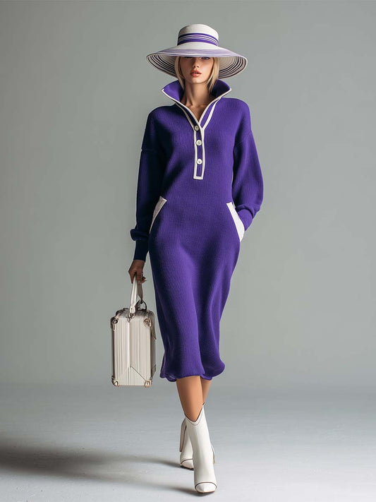 Élégante Robe Midi Tricotée Violet à Col Montant et Boutons