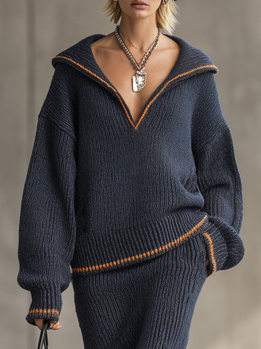 Ensemble Tricoté Chic : Sweat-Shirt Ample à Contraste et Jupe Assortie