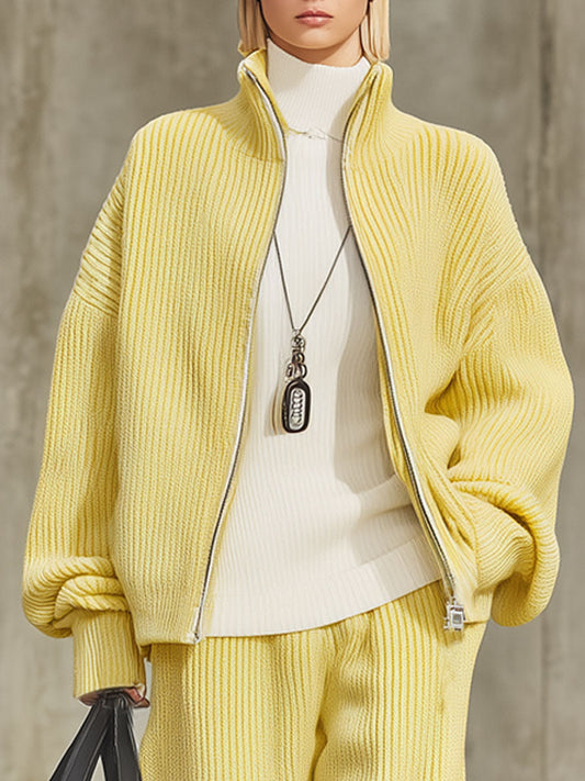 Ensemble Chic en Tricot : Cardigan Zippé à Col Montant et Pantalons à Jambe Large