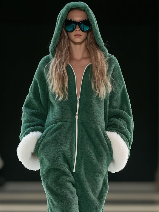 【Expédition Rapide en 24h】Sweat à Capuche Zippé en Polaire Verte et Blanche - Style Décontracté