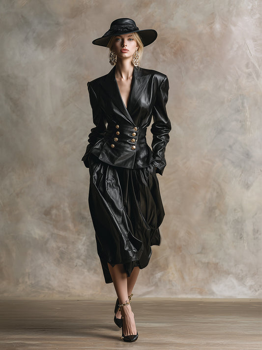 Ensemble Chic en Simili Cuir Noir : Jupe à Épaules Larges au Style Rétro
