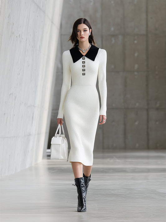 Robe Midi Tricotée Blanche avec Détails Noir et Argent en Patchwork