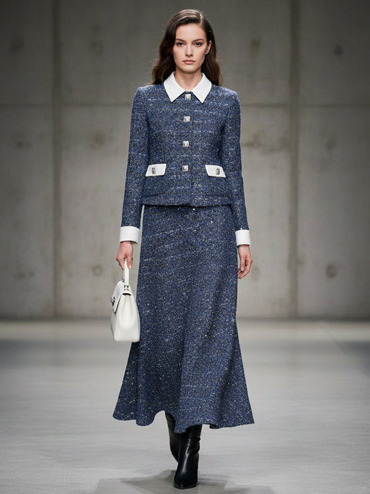 Chic Ensemble Tweed Bleu : Veste et Jupe Éblouissantes avec Sequins Dorés et Détails Blancs