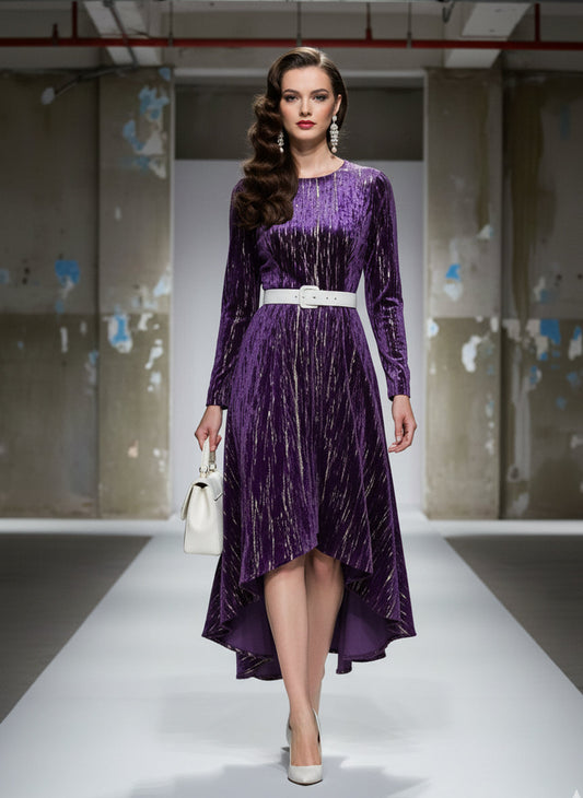 Robe Midi Luxe en Velours Violet avec Estampage à Chaud et Col Rond