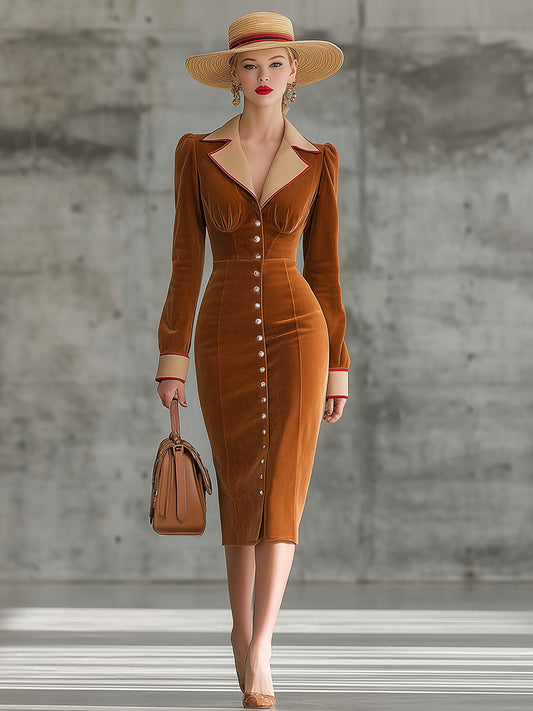 Exquisite Brown Caramel Velvet Midi Dress with Faux Leather Accents