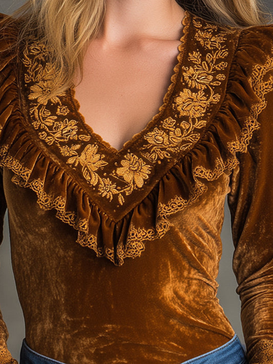 Top en Velours Brun à Col V avec Dentelle Élégante et Manches Trompette