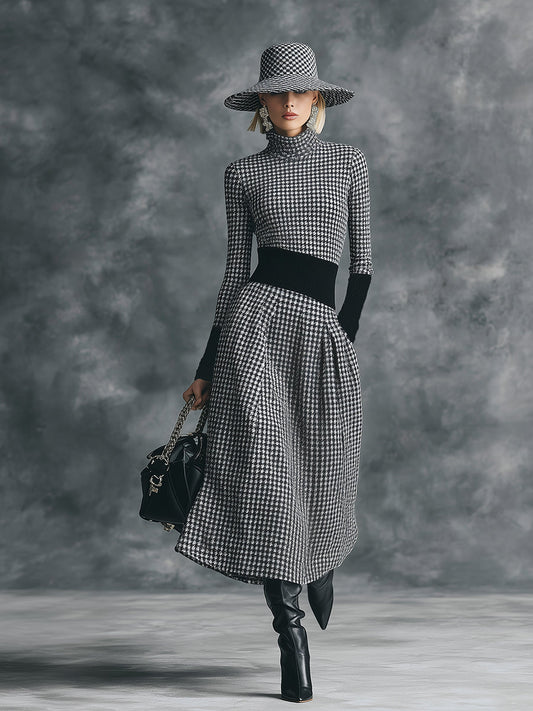 Robe Midi Houndstooth Chic à Col Montant Élégant