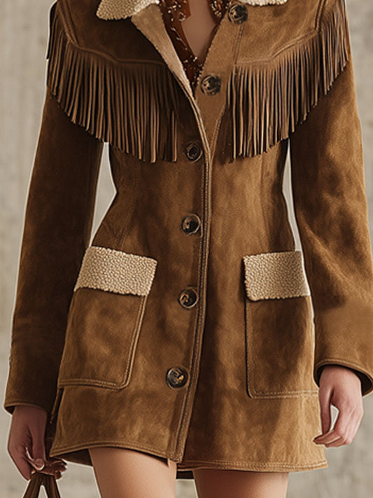Veste en Suède Synthétique avec Col Sherpa et Franges Western Chic