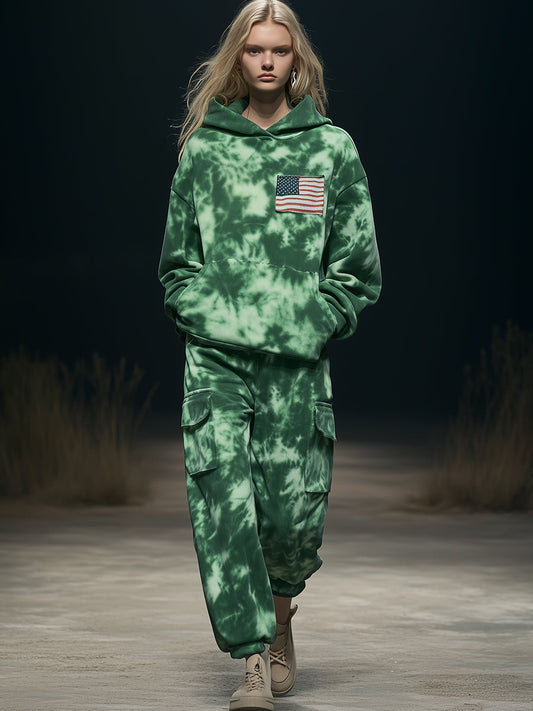 Pull à capuche tendance personnalisé avec impression tie-dye verte et motif drapeau américain