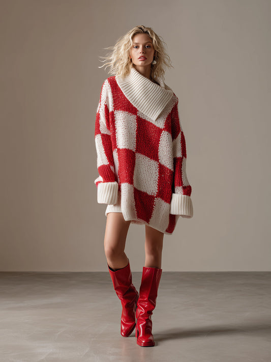 Robe Mini Tricotée à Col Asymétrique en Étoffe à Carreaux Rouges et Blancs