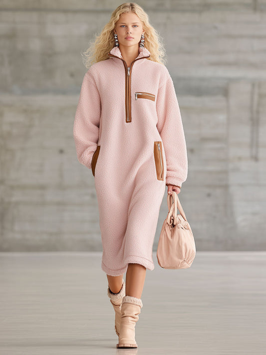 Robe Midi Polaire Rose avec Zip Demi en PU Marron - Style Rétro Western