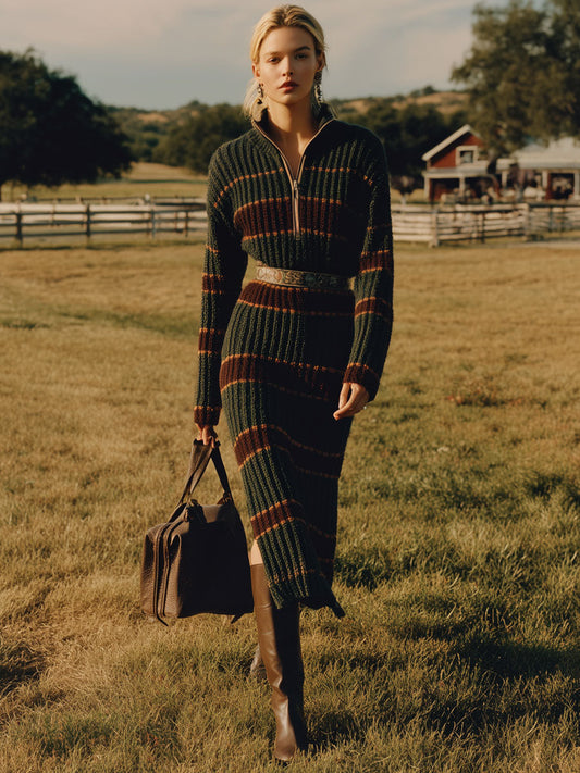 Robe Midi Tricotée à Rayures Rouge et Marron avec Demi-Fermeture Éclair