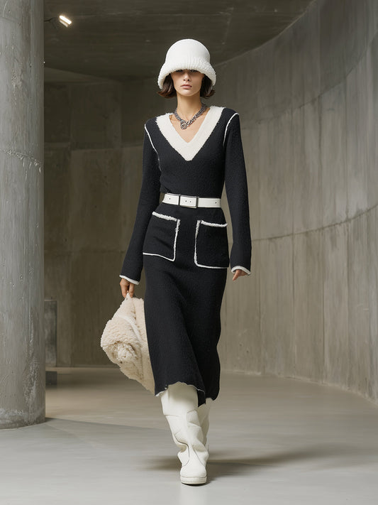 Chic Noir et Blanc : Robe Midi en Tricot en V