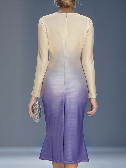 Robe Midi Élégante à Motif Floral 3D en Dégradé Beige et Violet
