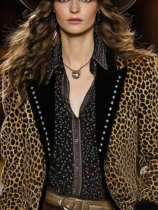 Veste en velours rétro à imprimé léopard avec contraste et bouton unique
