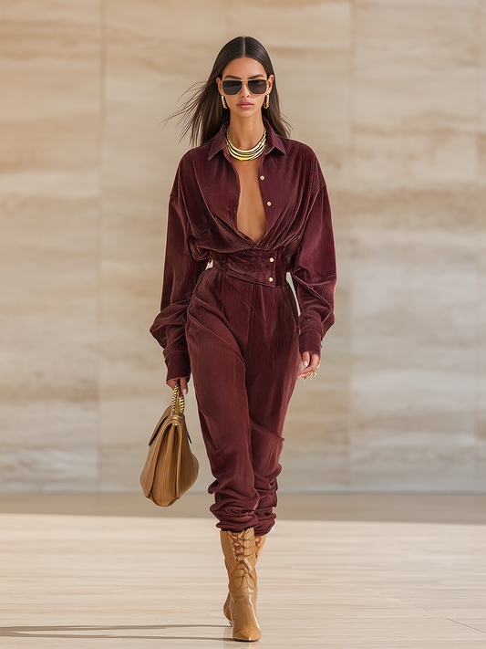 Combinaison Pantalon Large en Velours Côtelé Rouge Vin avec Détails en Dentelle et Manches Longues – Style Rétro