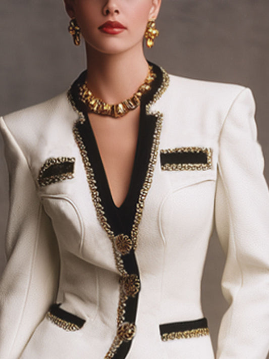 Veste Élégante en Laine à Col V avec Détails Contrastés