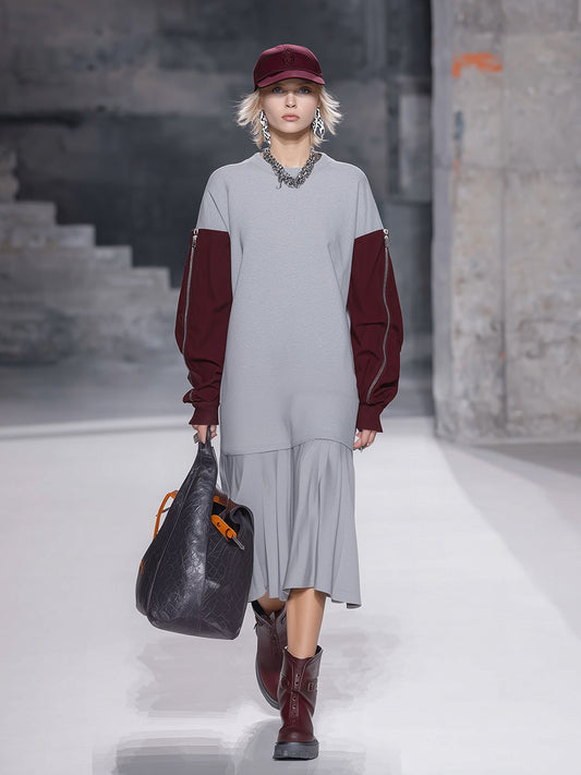 Robe Midi Sportive à Ourlet Plissé et Teintes Contrastées