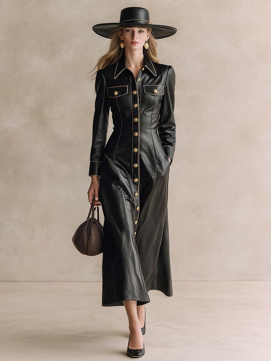 Robe Maxi Noire en PU avec Boutons Frontaux et Col Tendance