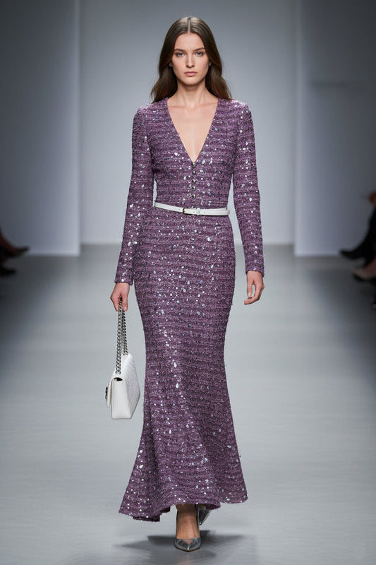 Robe Maxi Fishtail Violet en Tweed avec Sequins et Décolleté en V Élégant