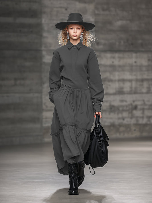 Robe Maxi Grise à Col Roulé et Volants - Élégance Sportive Décontractée