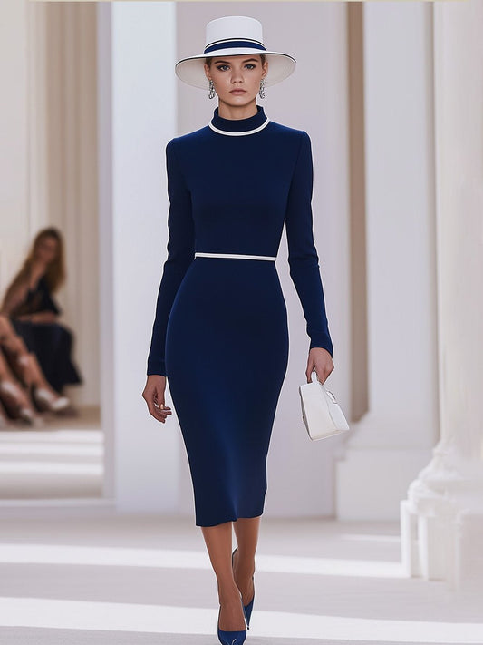Expédition rapide en 24h : Élégante robe midi classique à col montant et manches longues
