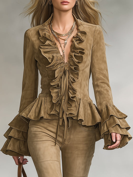 Ensemble Chic en Suédine Kaki Vintage avec Volants