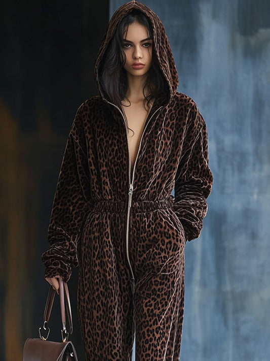 Combinaison Vintage en Velours Léopard : Confort Élégant avec Capuche et Taille Élastique - Expédition en 24 Heures !