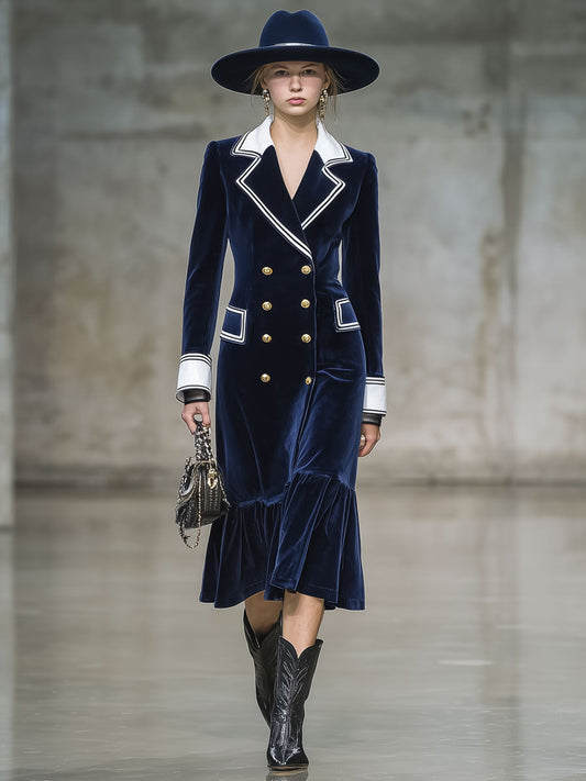 Robe Midi en Velours Marine à Volants avec Détails Écrus