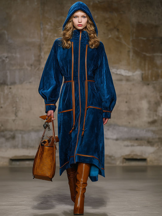 Robe Midi en Velours Bleu Nuit avec Cape Élégante et Finitions Marron