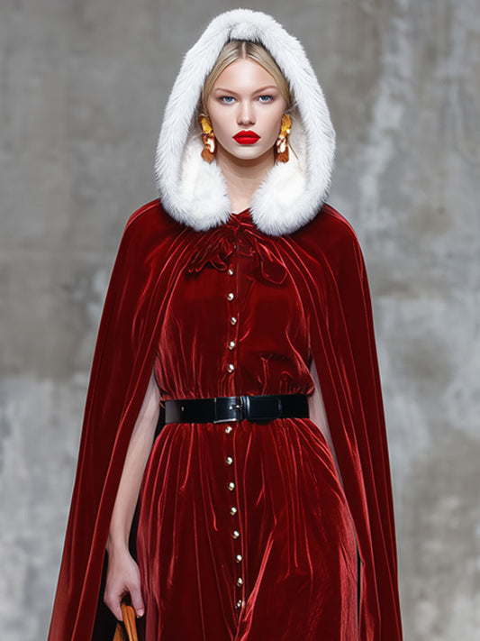 Robe Capée Vintage en Velours Rouge avec Col en Fourrure et Capuche