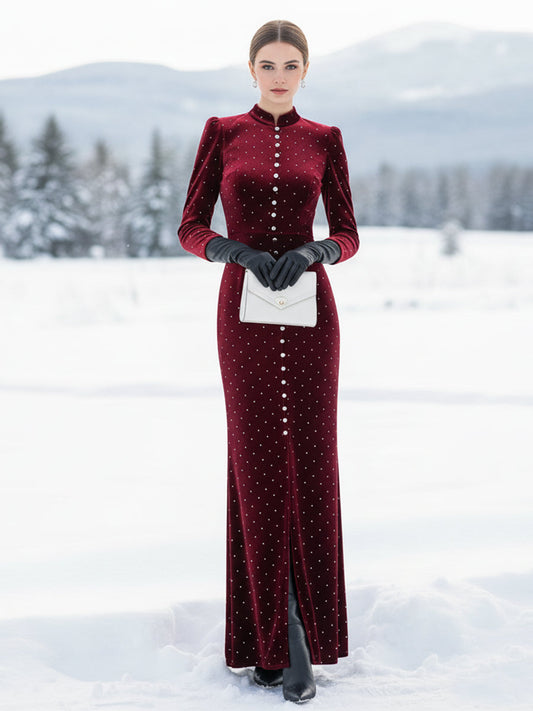 Maxi Robe en Velours Rouge avec Col Montant et Détails Éclatants