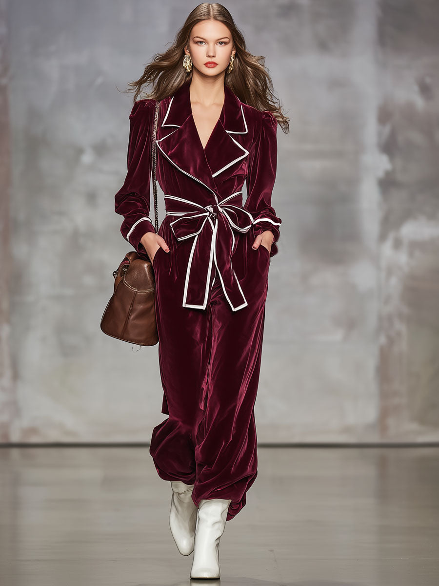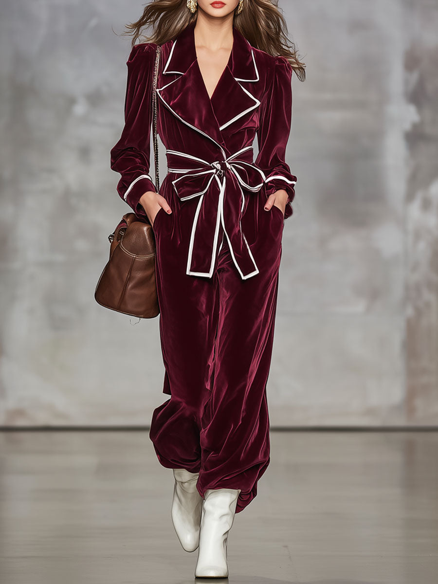 Combinaison en velours à manches longues avec cravate contrastée et col décontracté