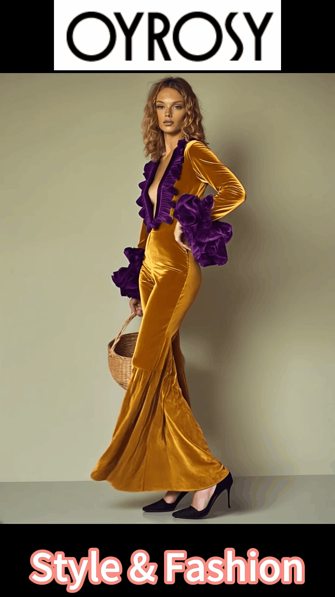 Combinaison en Velours Doré avec Volants Mauves et Manches Longues pour une Soirée Élégante