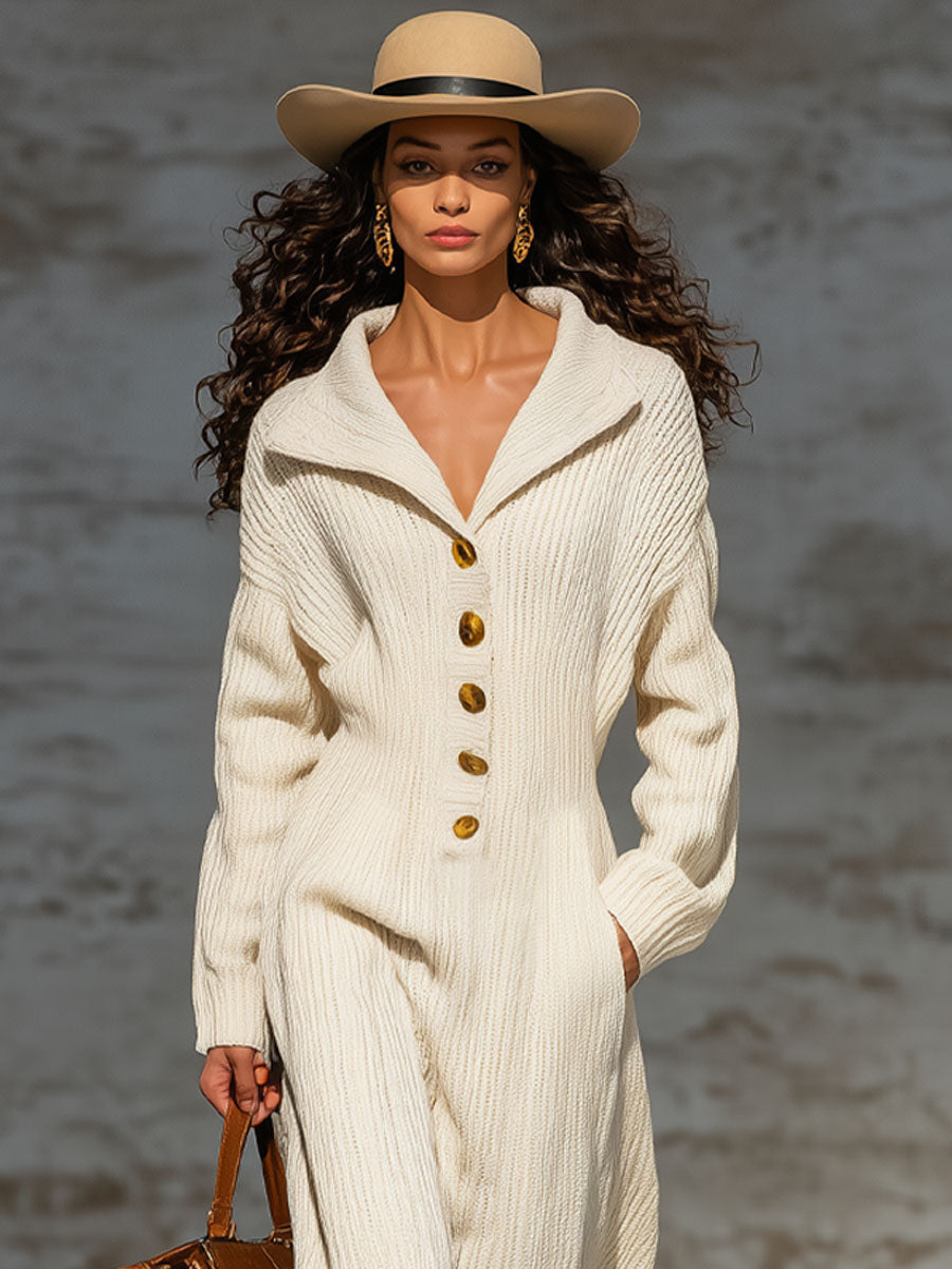 Combinaison Tricotée Élégante avec Col Revers et Boutons Décontractés