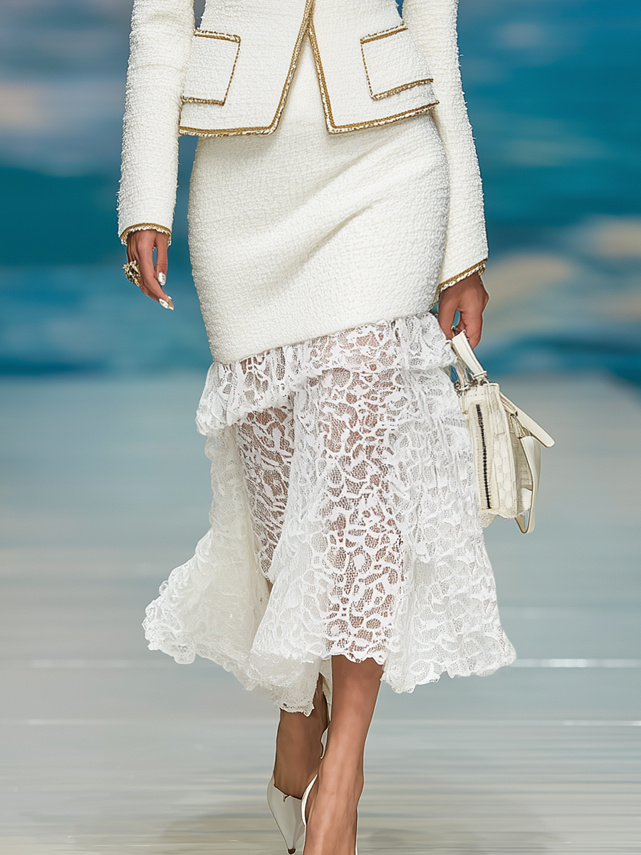 Ensemble Chic : Veste en Tweed à Col Rond Contrasté et Jupe Assortie