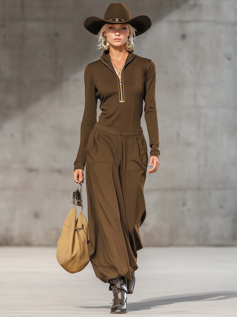 Ensemble Sportif Rétro en Gris Foncé avec Col Mi-Haut, Zip Avant et Pantalons Amples
