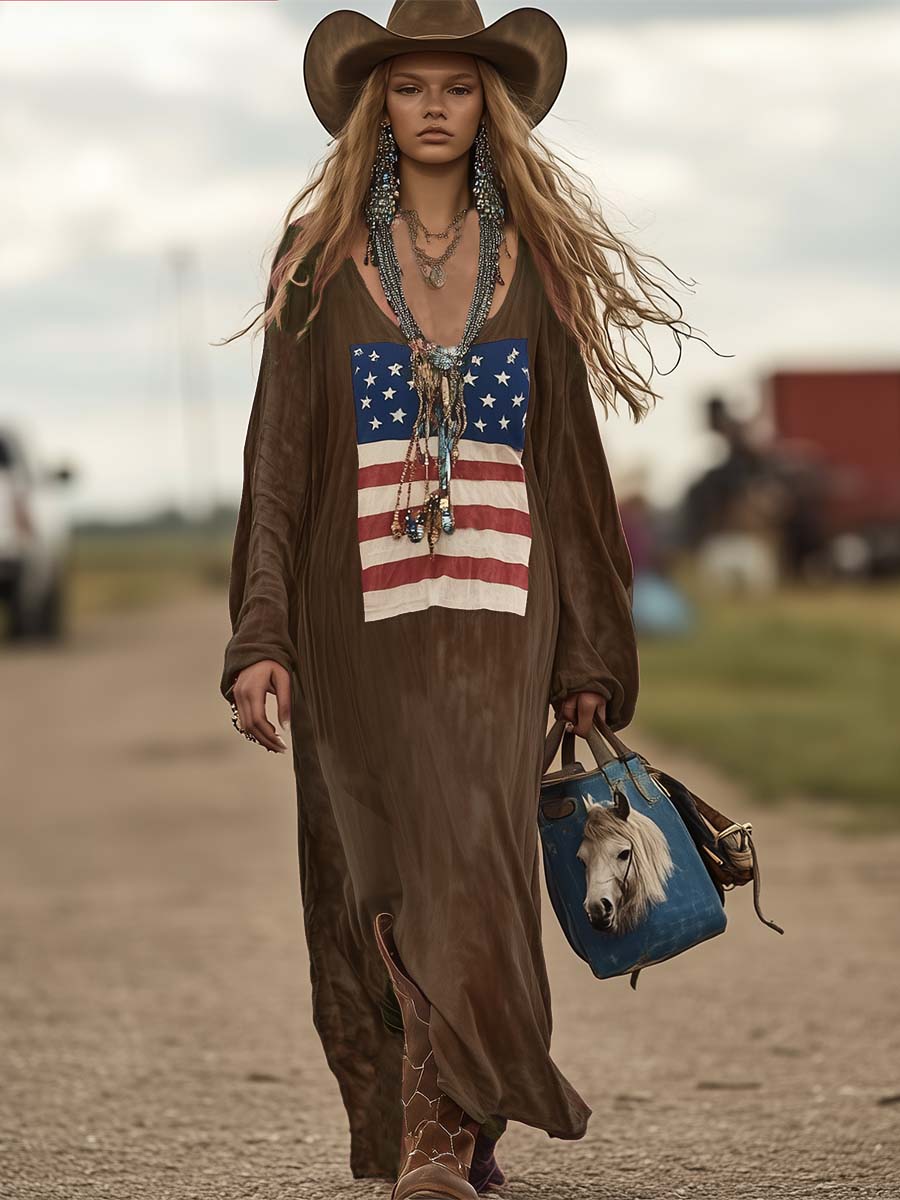 Robe Maxi Décontractée en Coton Rose avec Imprimé Drapeau Vintage - Livraison en 24 Heures