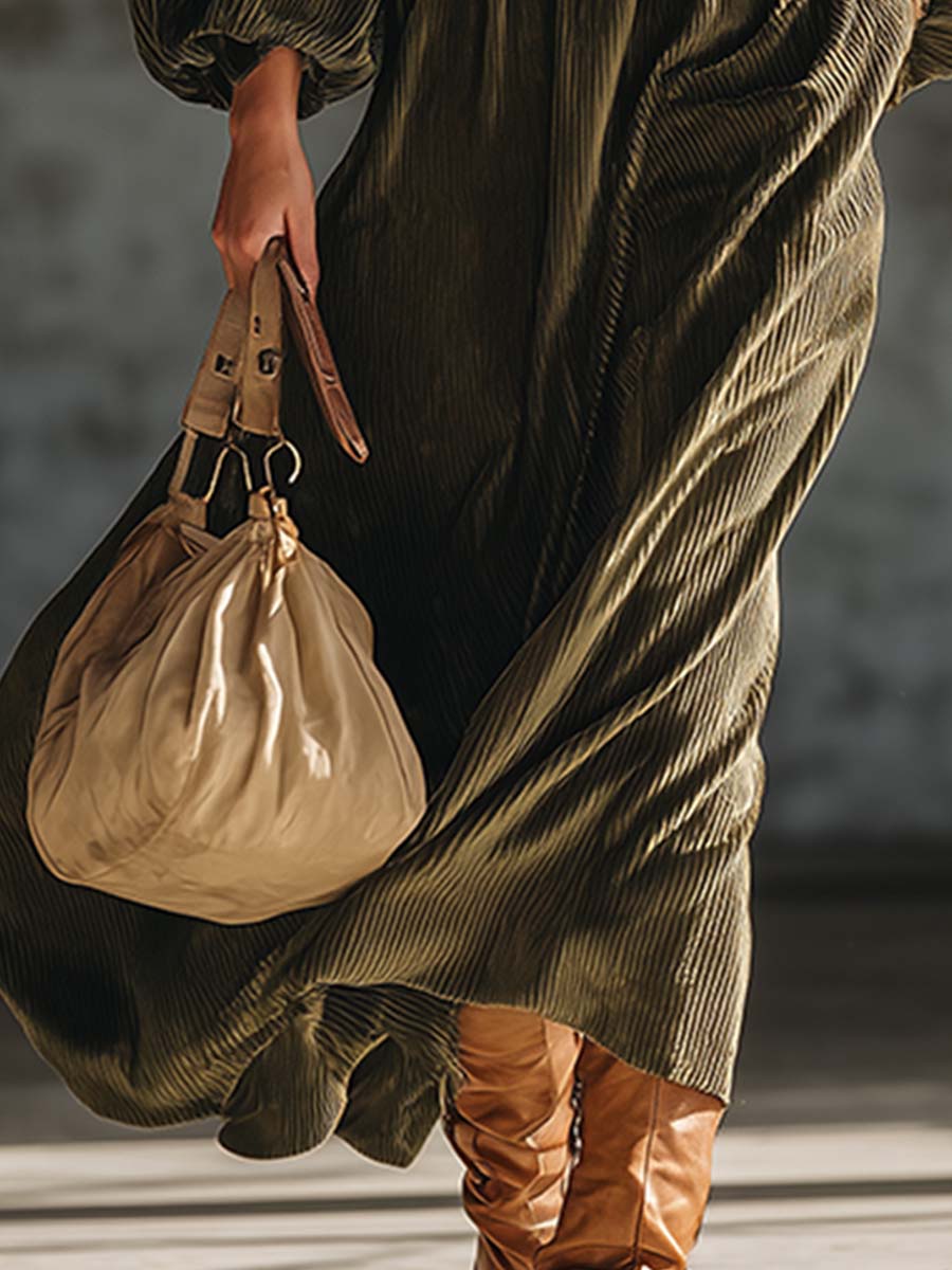 Robe Maxi Décontractée en Velours Texturé Vert Armée au Style Rétro