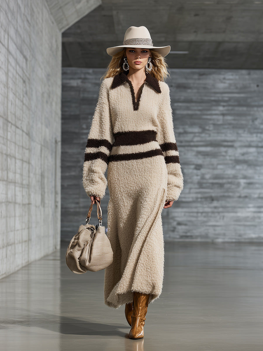 Robe Maxi en Fleece Corail avec Col Contrasté – Élégance Luxe