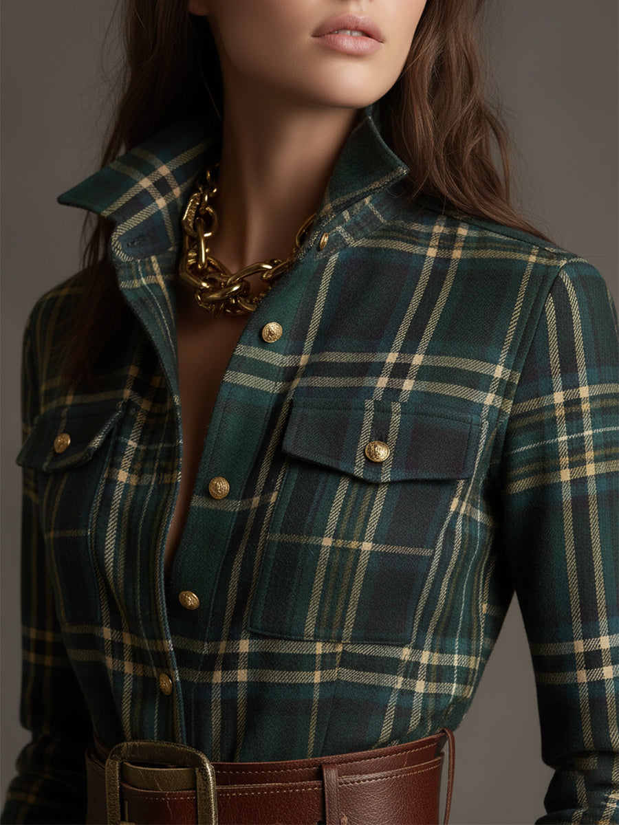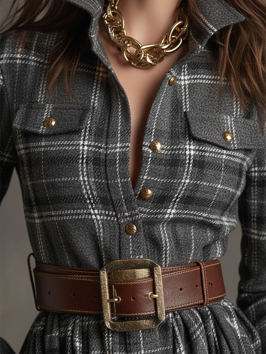 • Design : Élégant col, motifs à carreaux contrastés, ceinture raffinée.