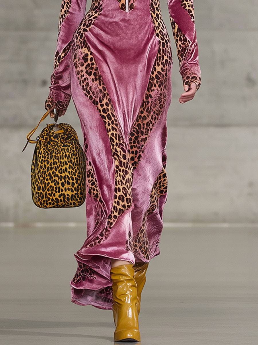 Robe Maxi Sport en Velours Rouge Rose avec Imprimé Léopard Vintage