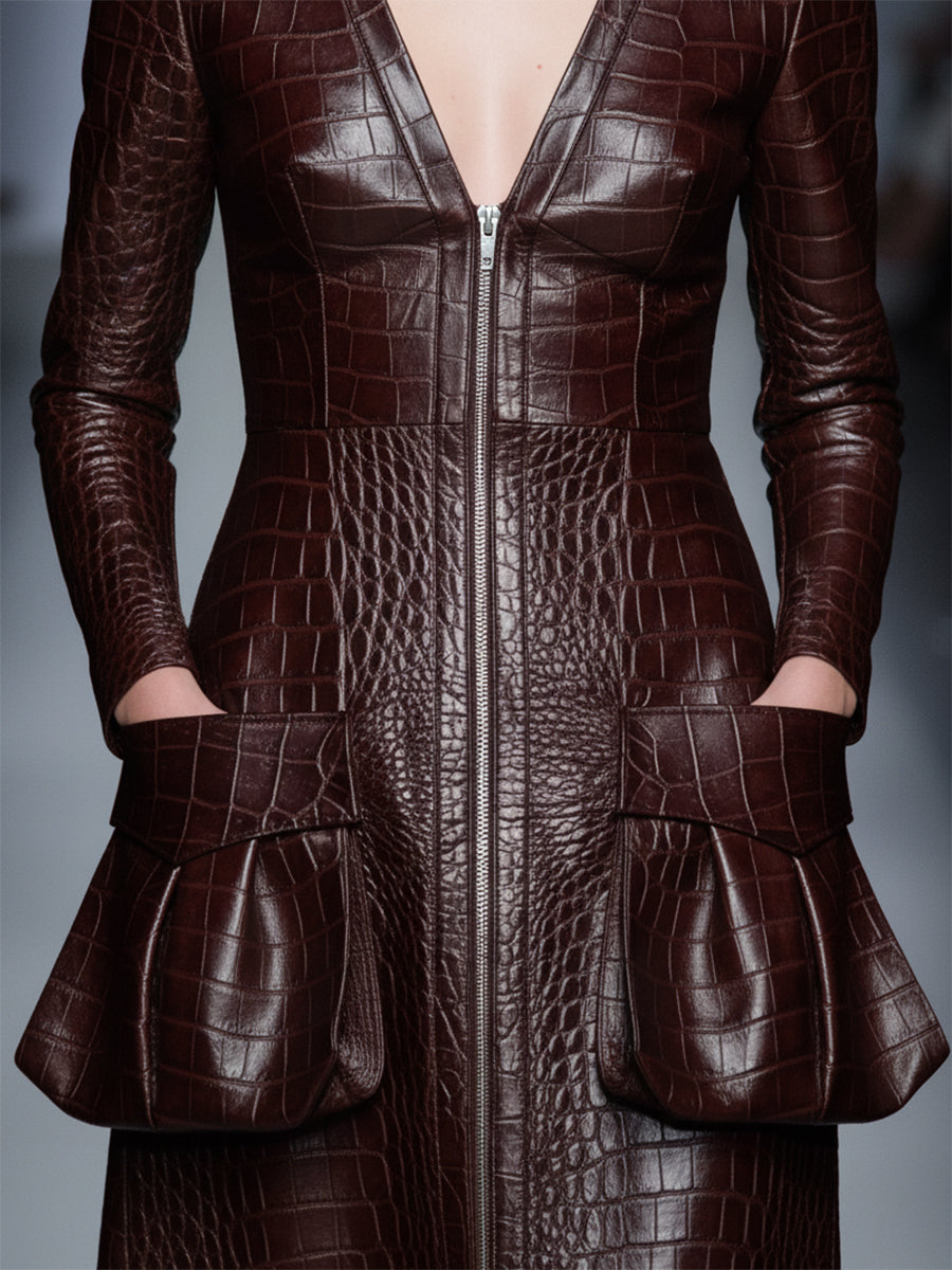 Robe Midi en Cuir PU Croco Rouge Brun avec Décolleté en V et Zip