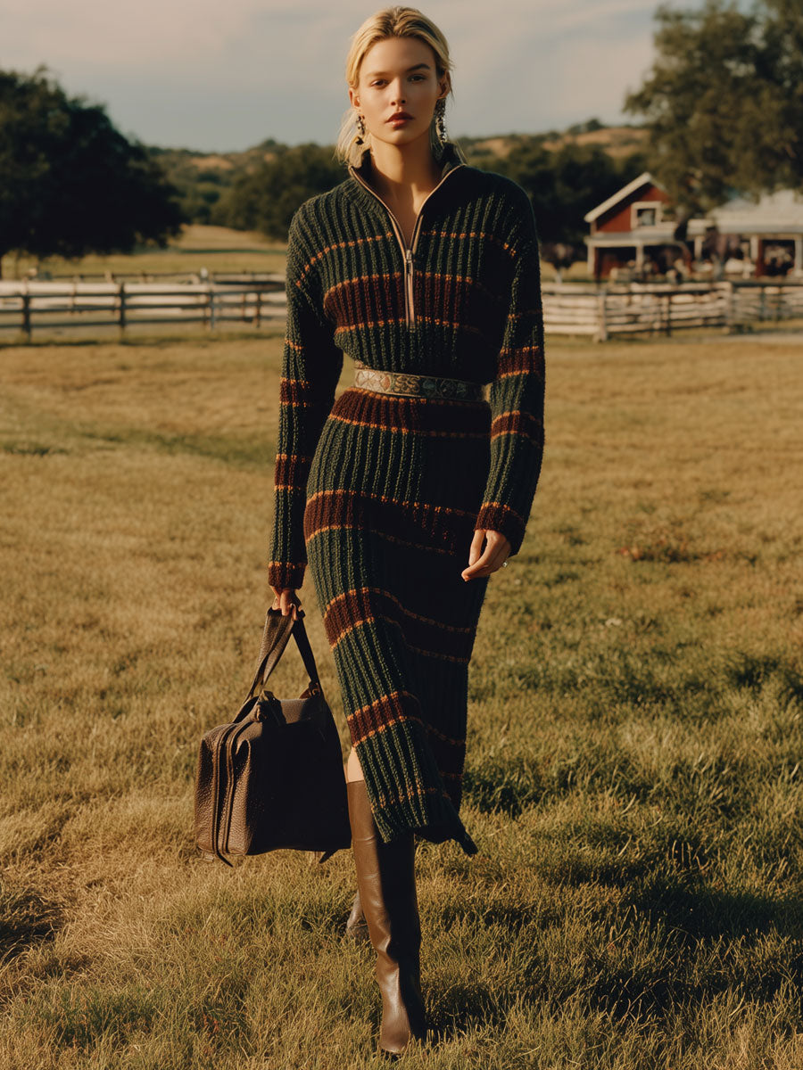 Robe Midi Rétro en Tricot Rayée Vert Foncé avec Fente et Demi-Zip