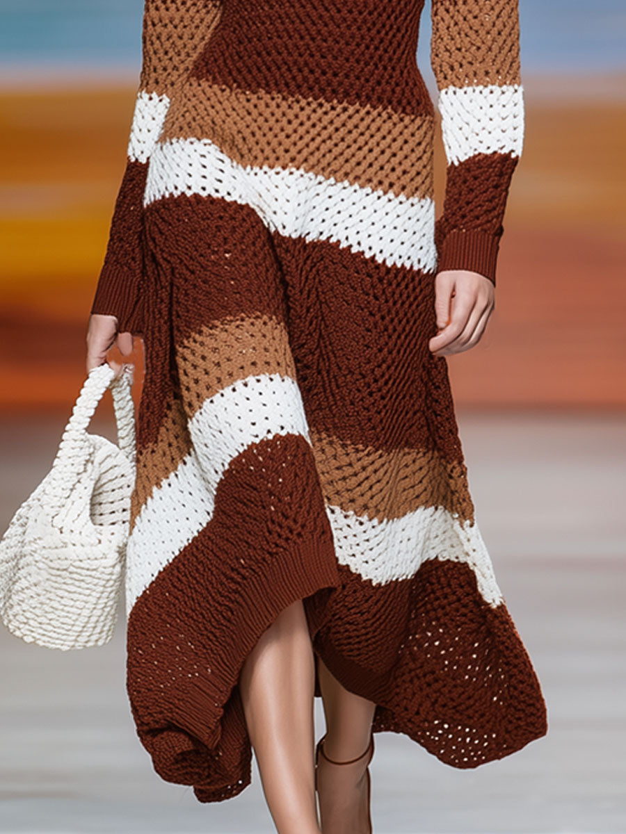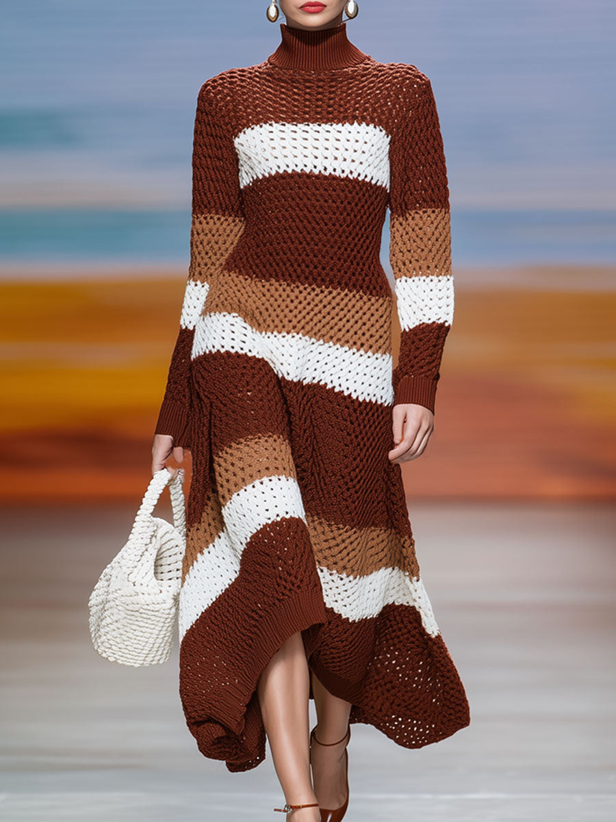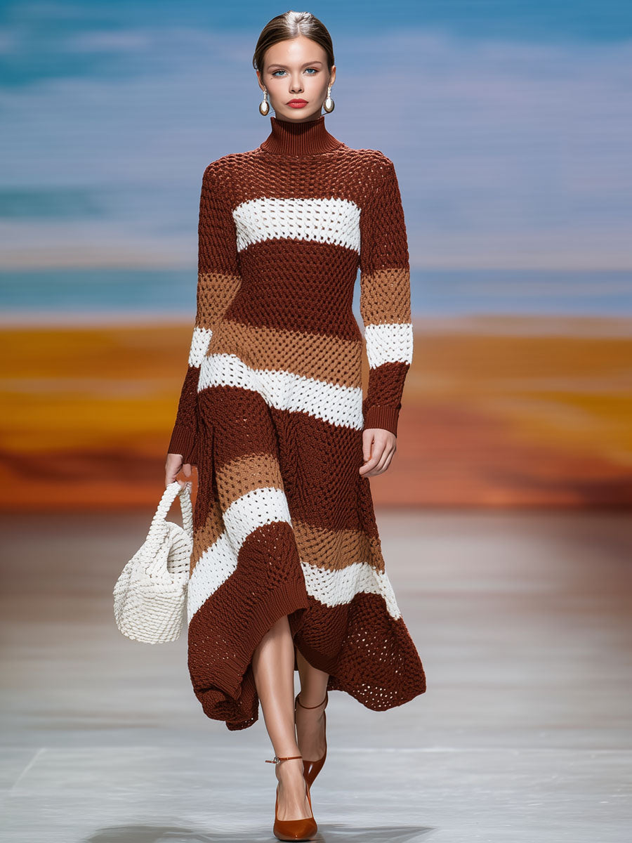 Robe Midi Tricotée Rétro à Rayures - Col Montant et Manches Longues